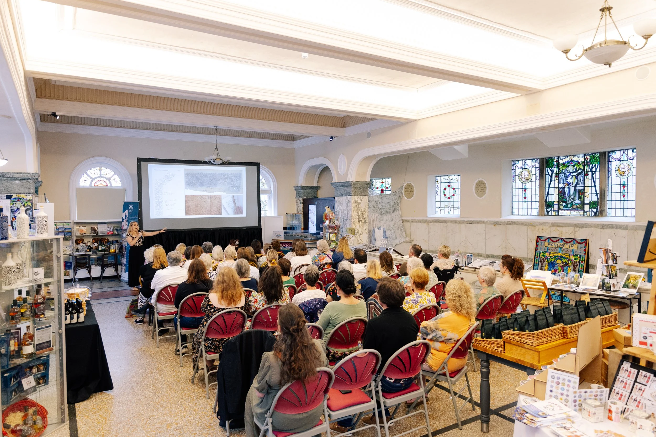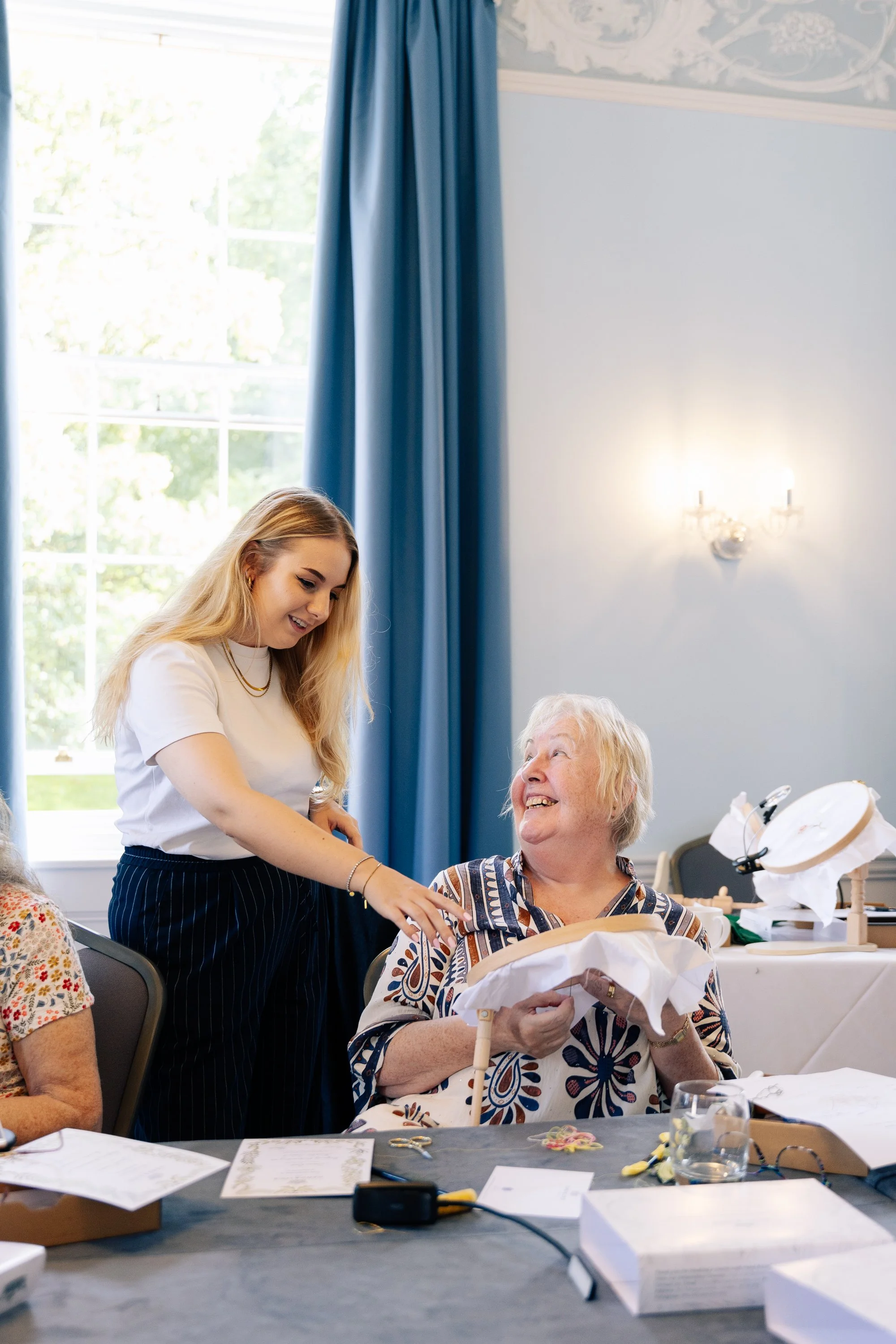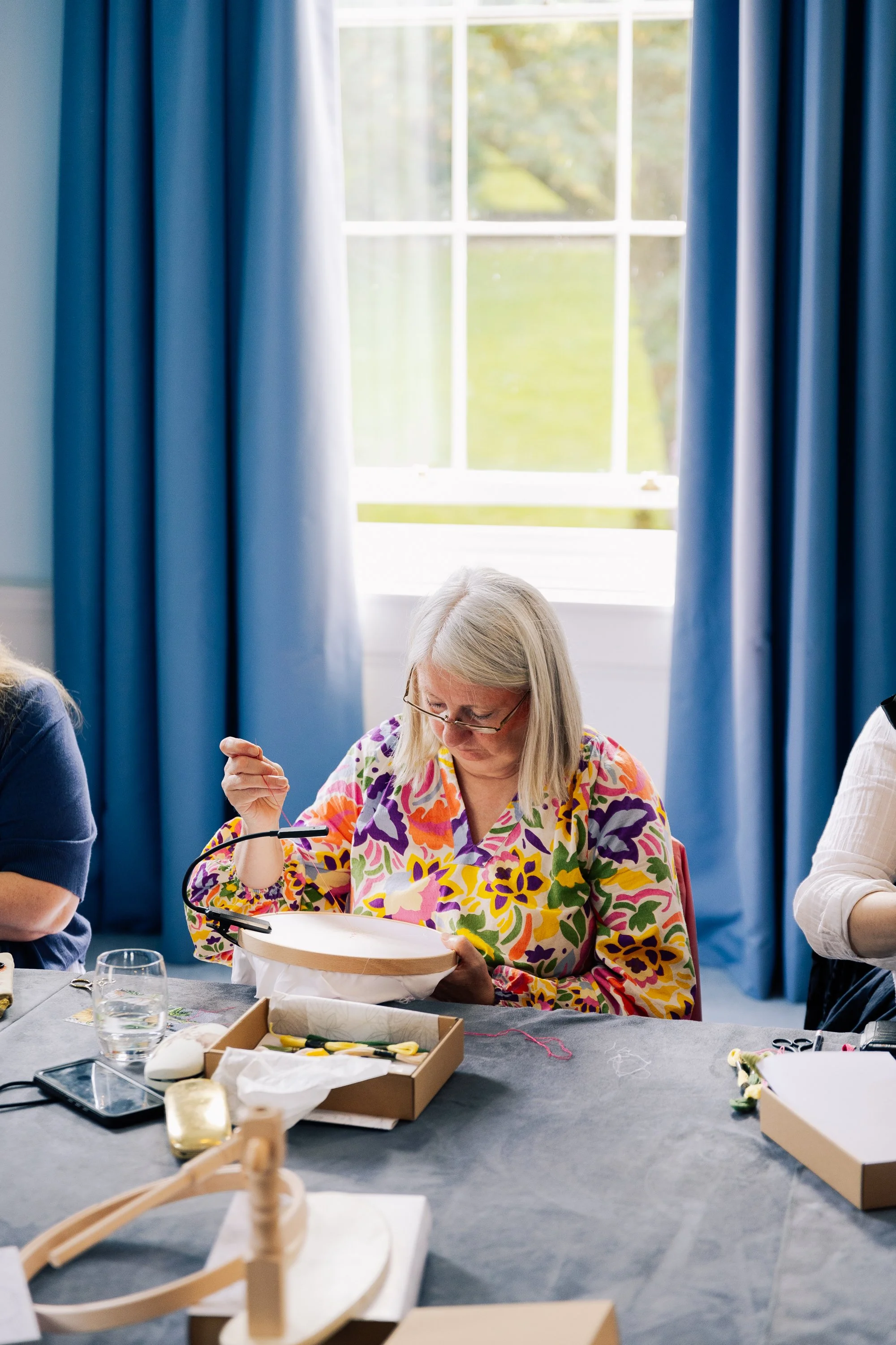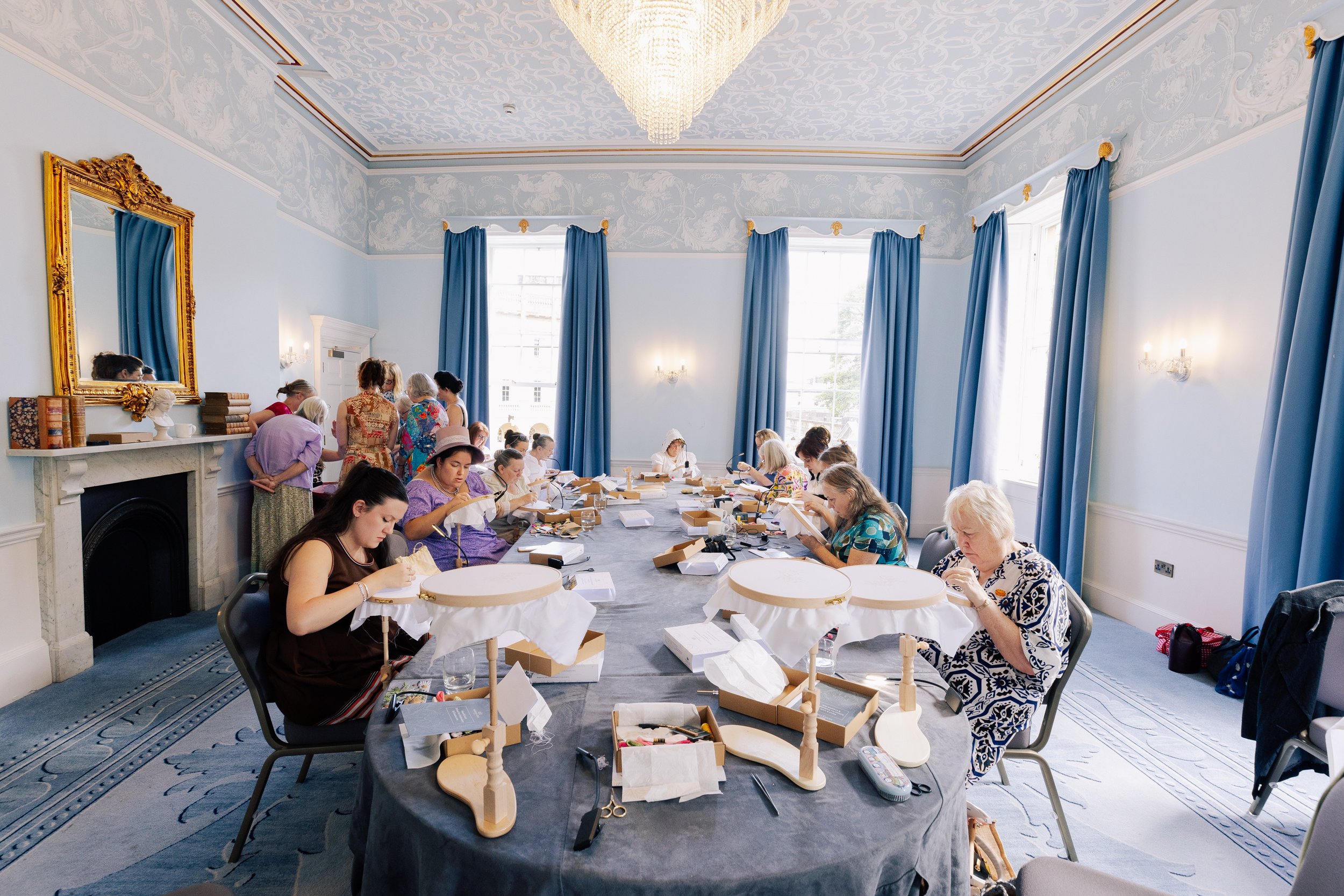 Summer 2025 - Buxton - Photos of the Regency Silk & Goldwork Embroidery workshop by Hand & Lock, led by Lucy Martin in The Blue Room of Buxton Crescent Hotel. The workshop was followed by Lucy’s talk in The Pump Room: ‘Inside the Atelier'.’
